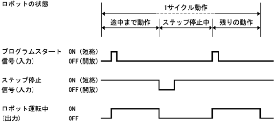 - この信号がON(短絡)→OFF(開放)されると、ロボットは現在実行中のステップを終了した時点で、全タスクを停止し、ロボット運転中出力をOFFします。しかし自動モード、外部モードは維持されており、プログラム操作コマンド(起動)の入力でプログラムの続きを実行します。下図をご参照ください。