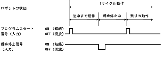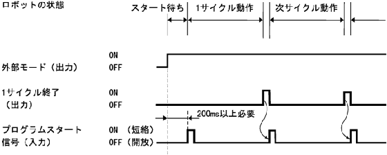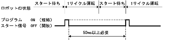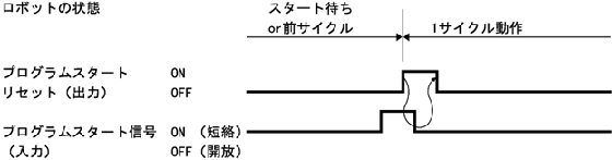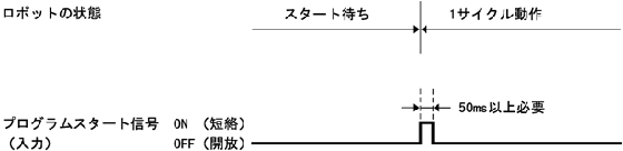 ロボットがプログラムを未だ実行していないとき、または、1サイクル終了して停止中のとき、プログラムスタート信号を入力すると(OFFからON)、プログラムNo.選択信号を読み込み、そのプログラムを1サイクル実行して停止します。