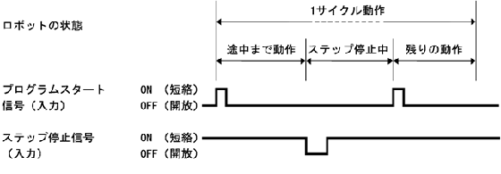 プログラム実行途中のステップ停止状態で、プログラムスタート信号をOFFからONさせると、停止しているステップの次のステップから実行を開始し、サイクルエンドで停止します。