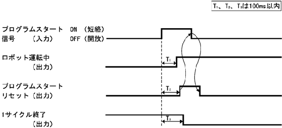ロボットが毎サイクル停止してから、プログラムスタート信号を立ち上げる方法の場合にのみ使用してください。 - プログラムスタート信号を入力してから、ロボット運転中、プログラムスタートリセット、1サイクル終了の順番で出力信号は変化します。(下図のT1→T2→T3)