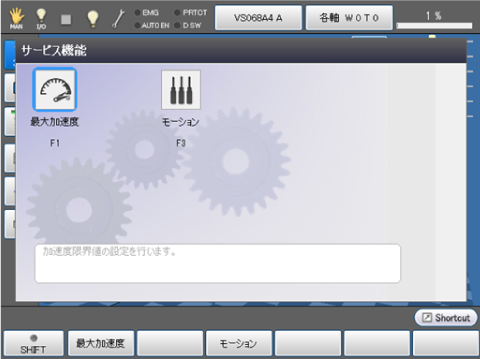 | [F3 モーション] | 手先制限速度(手動動作時の最大速度)の設定を行います。(この機能はVer.2.5.*から有効) |