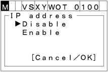 上下カーソルキーで、DHCPを"Disable"(使用不可)、"Enable"(使用可)から選択し、[OK]を押して、DHCPを変更します。