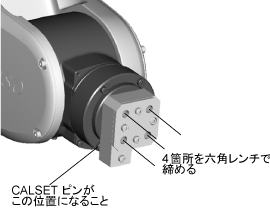 VS-***シリーズロボット(クリーンタイプ)の第6軸CALSET位置は専用の治具で決ます。第6軸は無限回転軸ですので位置決めの際に、何回転したかを確認する必要はありません。
