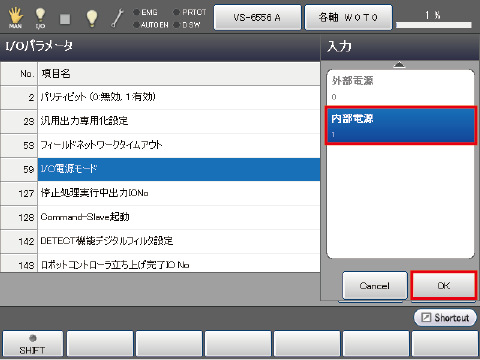 [I/Oパラメータ] ウィンドウが表示されます。パラメータ[59 : I/O電源モード]を"1 : 内部電源"に設定し、[OK]を押します。