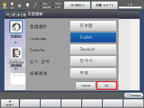操作経路: [F6 設定]-[F3 ペンダントと操作盤]-[F1 言語設定]