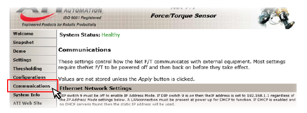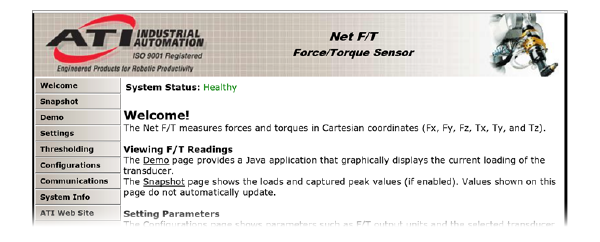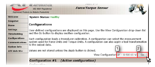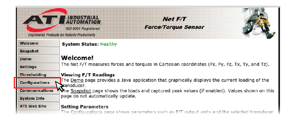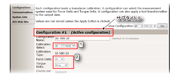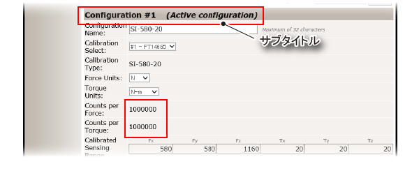 画面が更新されたら、サブタイトル[Configuration #1 (Active configuration)]の[Counts per Force]と[Counts per Torque]の値が"1000000"になっていることを確認してください。