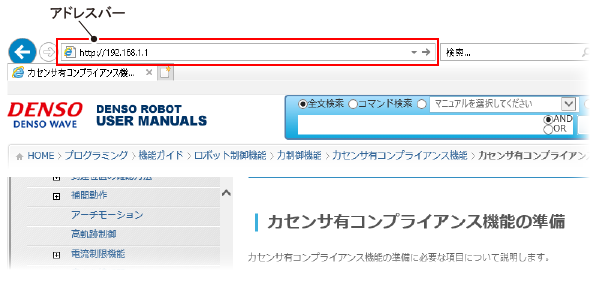 ブラウザを起動後、アドレスバーに"http://"に続いてNetボックスのIPアドレスを入力し、Enterキーを押します (この説明では、"http://192.168.1.1"を入力します)。