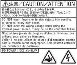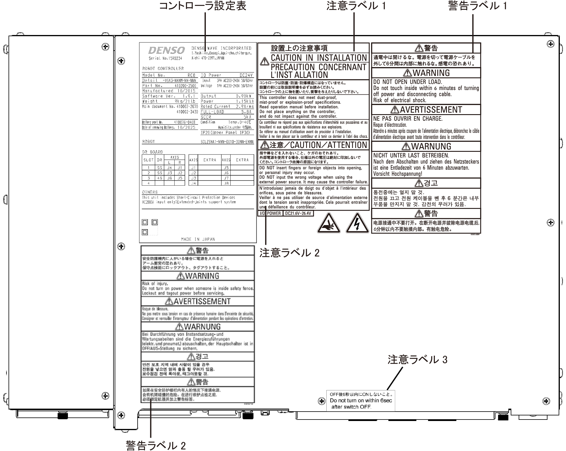(コントローラの保守点検時の警告) 通電中は開けるな。電源を切って電源ケーブルを外して6分間は内部に触れるな。感電の恐れあり。 |