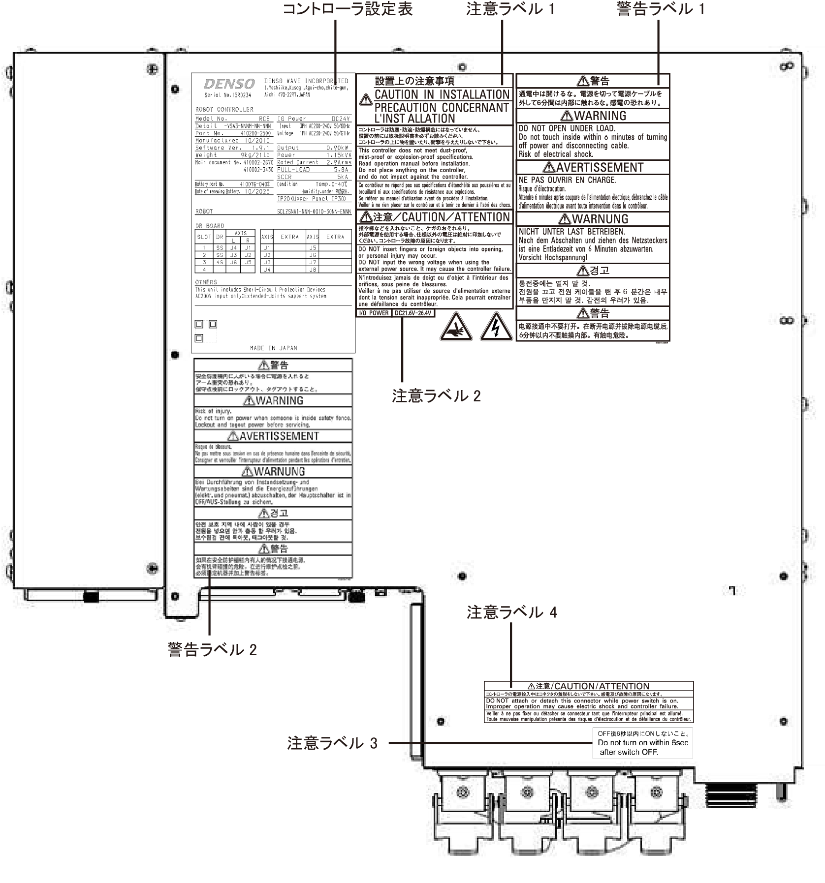 コントローラには、下表の警告ラベル・注意ラベルが貼ってあります。貼付部付近には特有の危険や注意事項がありますので、ラベルの記載事項は遵守してください。