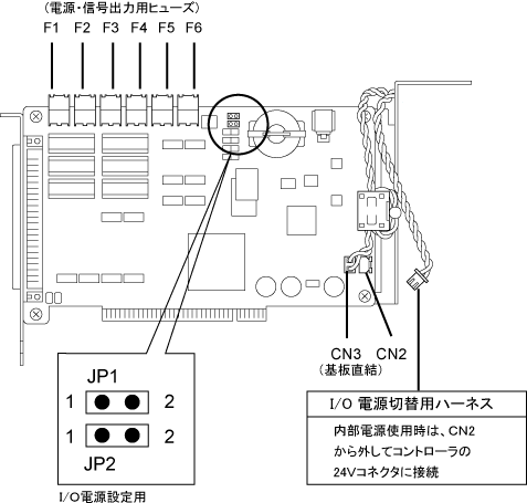 パラレルI/Oボードは、I/O用電源(+24V DC)を外部電源にするか内部電源にするかの設定ができます。工場出荷時は、外部電源設定になっています。