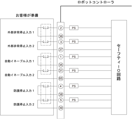 - 2つの自動イネーブル入力と2つの防護停止入力は別々の接続で制御して下さい。1つの接点での「2回路並列接続」または「1回路常時短絡」は、外部回路異常と判断し動作できません。