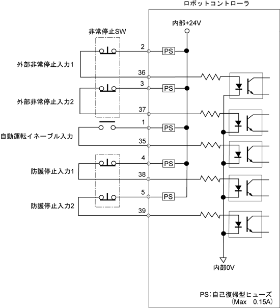 外部非常停止と自動イネーブルの信号は、安全のために重要な信号です。下図に示すように、必ず有接点の回路で構成してください。