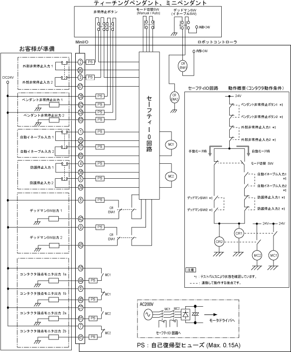 コントローラの安全回路の内部接続等価回路を下図に示します。実際の安全回路はセーフティリレー等から構成されています。