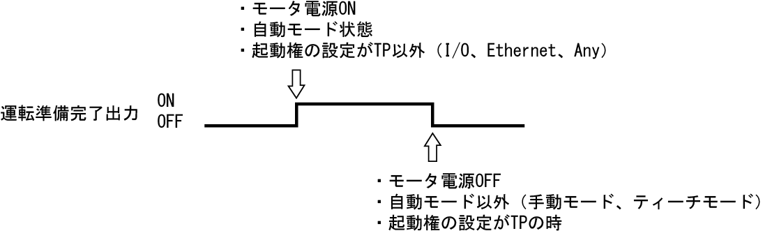 「モータ電源切り」、「自動モード以外(手動モード、ティーチモード)」、「起動権の設定がTPの時」のいずれかの状態でOFFになります。