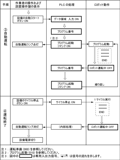 起動・停止のときの専用入出力信号と作業者の操作、設備操作盤の表示、PLCの処理およびロボットの動作との関係を示します。