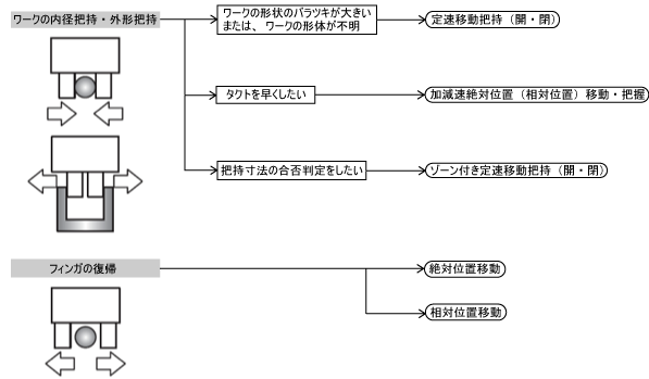 | 相対 | ワークの把持 ◇タクトが早く、衝撃が少ない ◆ワーク形状のばらつき小の時 |