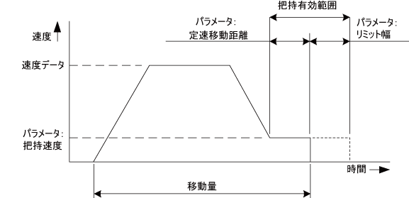 原点基準で指定した位置の手前まで台形速度制御にて移動し、把持直前でパラメータにて指定した把持速度にて移動します。その時の把持力は、指定した把持力となります。パラメータにて指定したリミット幅と定速移動距離の範囲内で把持した場合はHOLD信号とZON信号が出力されます。