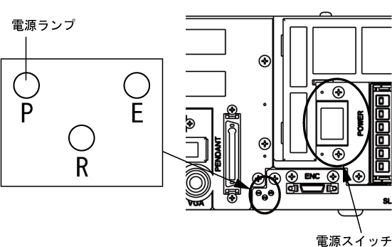 ロボット本体とコントローラを接続するケーブルの取り付け、取り外しに先だって、コントローラの電源が完全に切れていることを確認してください。