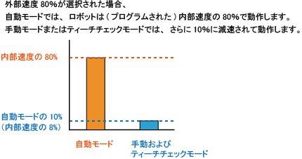 手動モード、ティーチチェックモードでは内部速度の10%の速度で動作するようになっています。たとえば外部速度に80%を設定すると、10%×80%、すなわち8%で動作します。実際の動作速度の例を下図に示します。 -