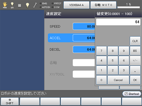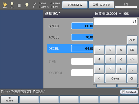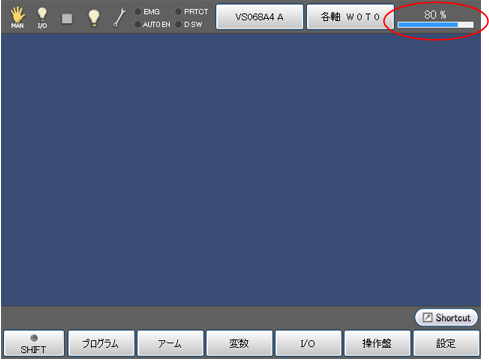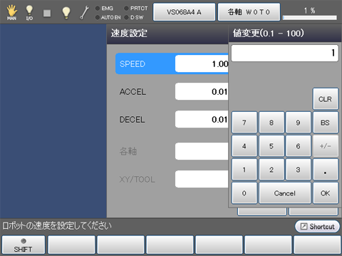 ティーチングペンダントの画面は、基本画面に戻ります。ステータスバー右端の速度表示が、以上の手順で設定した速度に更新されていることを確認ください。