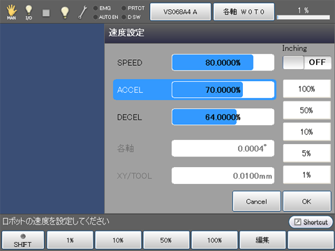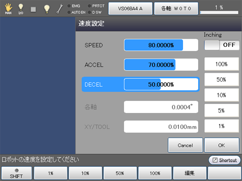 自動算出されたこれらの値はティーチングペンダントまたはミニペンダントを使って修正することもできます。そのときは、最新の修正値が有効になります。 - 外部速度の最小設定許容値は0.1%で、これに対応する外部加速度・外部減速度は0.0001%になります。1%以下の外部速度が設定されたときには、ティーチングペンダントまたはミニペンダントのステータスバー上にあるバーグラフの速度表示は1%になります。