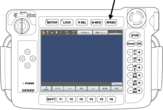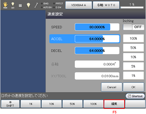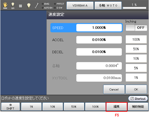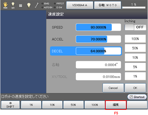 外部速度設定画面で、SPEED行が選択されていることを確認し、[F5 編集]を押してください。STEP3に示すテンキーが表示されます。