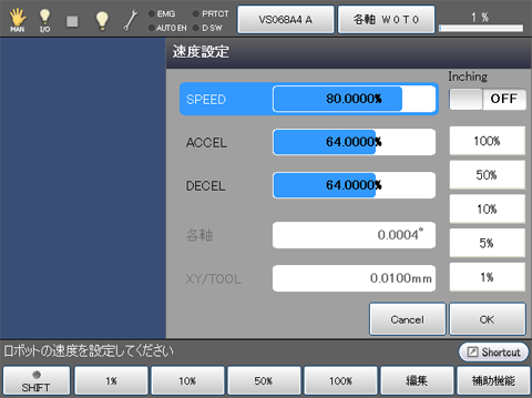 - 自動モードでは実際のロボットは[内部速度×外部速度(%)]で動作します。たとえば外部速度に80%を設定すると、内部速度×80%でロボットは動作します。