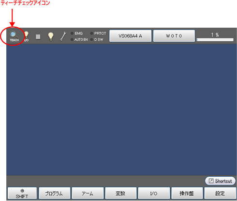 モード切替スイッチを[TEACHCHECK]に合わせます。 ステータスバーの左端部分にティーチチェックのアイコンが表示されます。