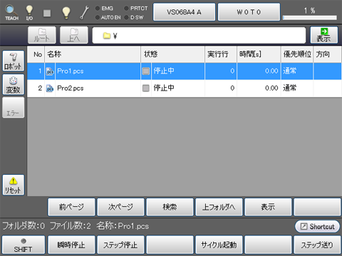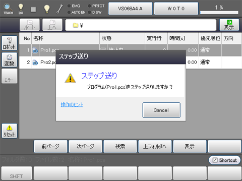 ステップ3にて示したプログラム一覧画面で[F6 ステップ送り](または右方向カーソルキー)を押します。次のようなシステムメッセージが表示されます。