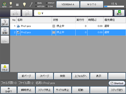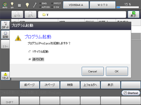 連続起動の場合、ロボットは「ロボット停止」、「瞬時停止」、「ステップ停止」 、「サイクル停止」のいずれかで停止させない限り、動作し続けます。