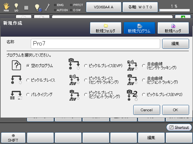 新規のプログラムを作成することができます。 [新規プログラム]キーを押すと、作成するプログラムの選択、名称の設定ウィンドウが表示されます。 一覧の中から使用するプログラムテンプレートを選択し、[編集]キーを押す(もしくは名称表示欄を押す)と文字列入力ウィンドウが表示されます。プログラムの名称を入力後[OK]キーを押すと、新規のプログラムが作成されます。 「空のプログラム」以外はあらかじめ準備されたプログラムで、プログラムテンプレート内に設定されている位置変数や、パレタイジングの個数など必要な変数を設定・登録するだけで簡単にプログラムを作成することができます。ピック&プレイス(センサトラッキング)とピック&プレイス(ビジョントラッキング)は3つのプログラムファイルが生成されます。 |