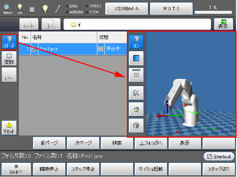 マシンロック時にロボットの3D画像を表示します。操作キーの説明については「ロボットの現在位置情報と3D画像の表示」を参照してください。 ロボットボタンが押されている時は、ボタンが青色に点灯します。 |