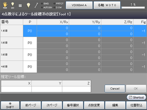 [F4 簡単教示]を押すと、次のような[※点教示によるツール座標系の設定]ウィンドウが表示されます。(図は、教示ポイントを4点とした場合の例です。)