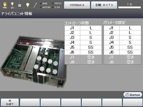 ドライバユニットのパラメータ設定情報と、実際にコントローラに取付けられているドライバユニットの情報を表示します。