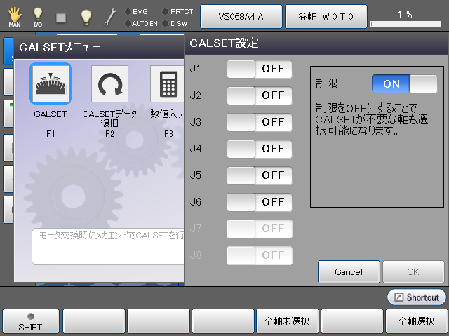 | 制限 | 制限をOFFにすることでCALSETが不要な軸も選択可能になります。 |