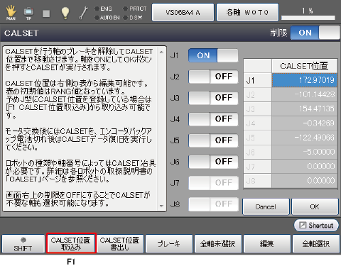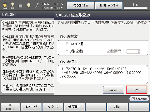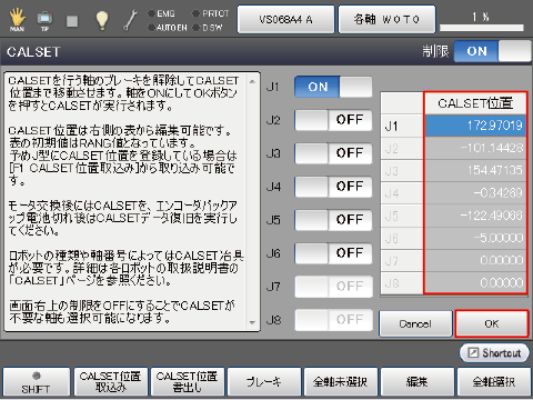 画面の[OK]を押すことで、画面右側に表示されているCALSET位置を用いてCALSETが実行されます。
