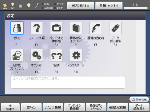 | [F3 ペンダントと操作盤] | 表示する言語や文字の大きさなど、表示にかかわる設定、および、操作盤の設定を行います。 |