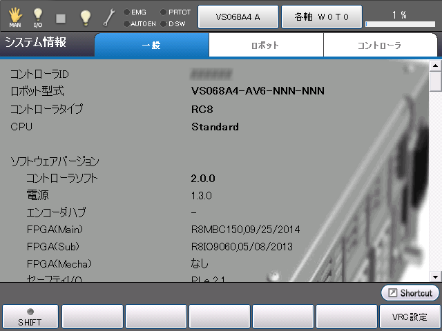 ソフトウェアのバージョンや設定されているロボットの型式、電源にかかわる情報などの情報を表示します。