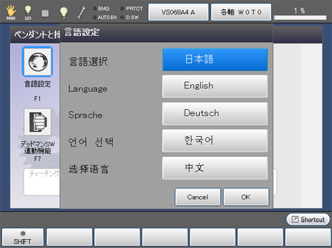 操作経路:[F6 設定] - [F3 ペンダントと操作盤] - [F1 言語設定]
