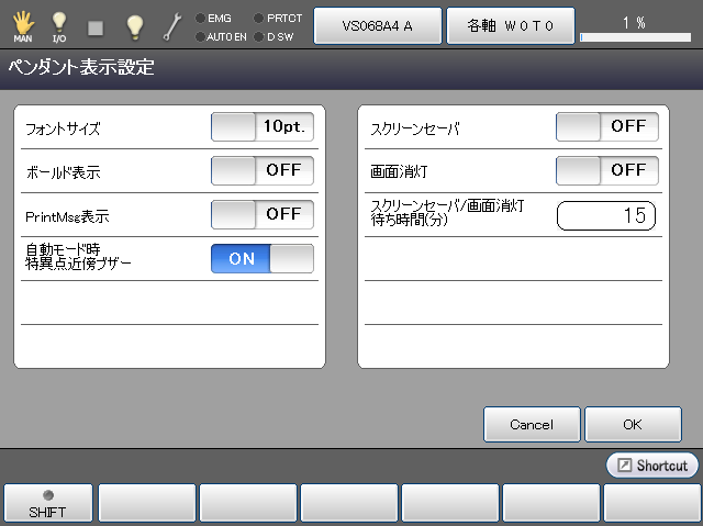 操作経路: [F6 設定] - [F3 ペンダントと操作盤] - [F2 ペンダント表示設定]