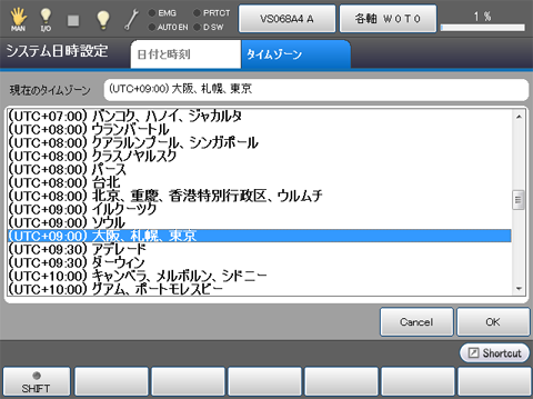 ティーチングペンダントの上下方向カーソルキーやジョグダイアルを使用して設定するタイムゾーンを表示・選択します。 選択後、[OK]を押すとタイムゾーンが設定されます。