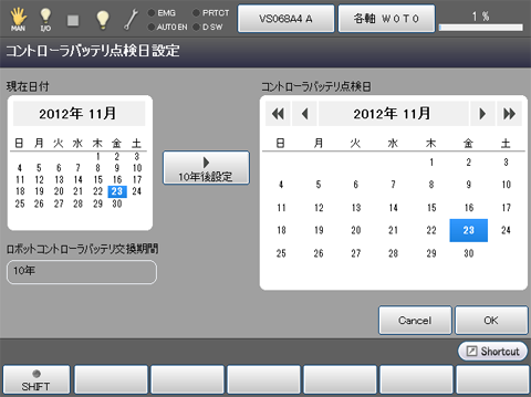 ティーチングペンダントの画面に直接タッチして、[設定]キーを押すと、次回のコントローラバッテリ点検日が設定されます。 設定した次回点検日は、[コントローラバッテリ点検日設定]ウィンドウの[OK]を押すと確定します。