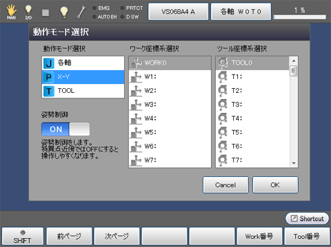 ティーチングペンダントの上下左右方向カーソルキー、もしくは、ジョグダイアルを使用して「動作モード」、「ワーク座標系」、「ツール座標系」のそれぞれ設定したい項目を選択します。画面に直接タッチしても選択できます。