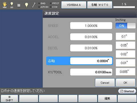 ティーチングペンダントの[SPEED]キーを押し、[Inching]を「ON」にすると、次のような[速度設定]ウィンドウが表示されます。