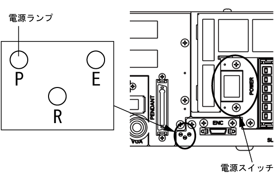 ロボット本体とコントローラを接続するケーブルの取付け、取り外しに先だって、コントローラの電源が完全に切れていることを確認してください。コントローラの電源が完全に切れていないとき、これらのケーブルの取付け、取り外しを行うと軸回転角エンコーダインターフェイス回路が破損する恐れがあります。この破損は、ハードウェアを取替えない限り回復できません。