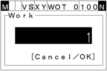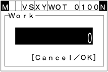 起動時には、WORK0(ベース座標)が設定されています。 数値を入力し、[OK]を押すと、任意のワーク座標系に変更します。 [Cancel]を押すと、ワーク座標系選択の変更が無効になります。