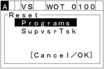[PROリセット]を押して、次のような「プログラムリセット画面」を表示します。 上下カーソルでリセットしたい項目を選択します。 ・Programs: 通常タスクプログラム ・SupvsrTsk: 特権タスクプログラム