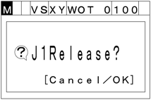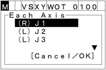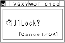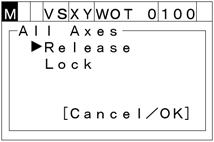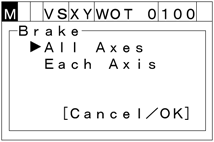 上下カーソルキーで 任意の軸にカーソルをあわせ[OK]を押すと、ブレーキの解除・ロックの切替え画面を表示します。