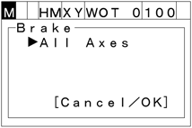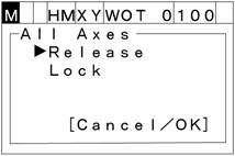上下カーソルキーで"Release"を選択して[OK]を押すと、「全軸ブレーキ設定画面」を、"Lock"を選択して[OK]を押すと、「全軸ブレーキロック画面」を表示します。