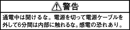 通電中は開けるな。電源を切って電源ケーブルを外して6分間は内部に触れるな。感電の恐れあり。 |